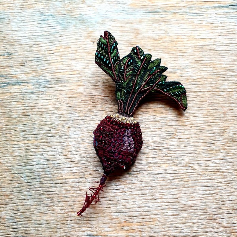 Rankų darbo siūlais ir karoliukais siuvinėta sagė.