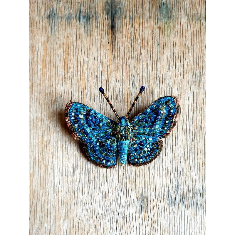 Rankų darbo siūlais ir karoliukais siuvinėta sagė.