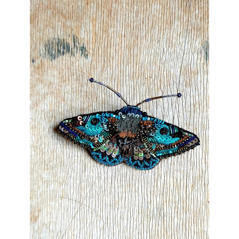 Rankų darbo siūlais ir karoliukais siuvinėta sagė.