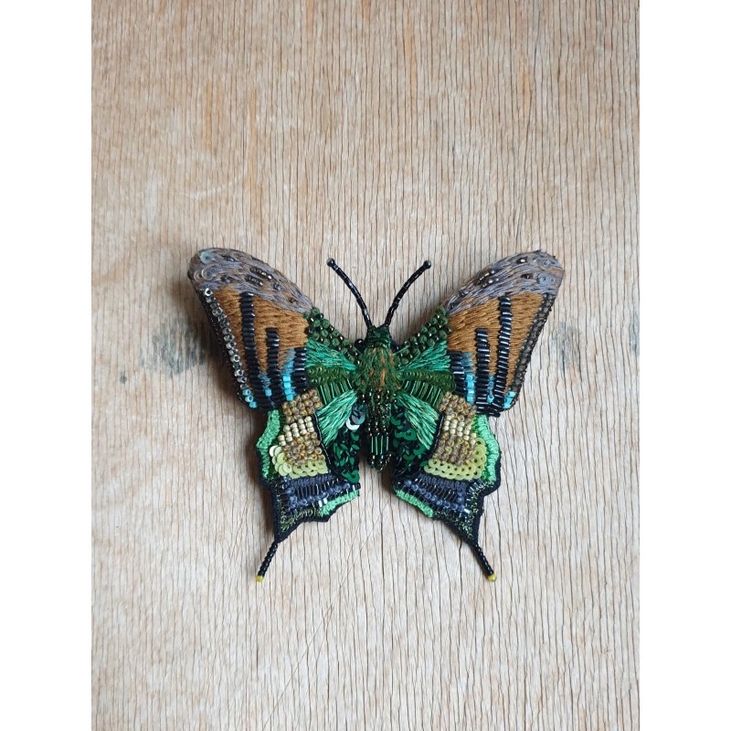 Rankų darbo siūlais ir karoliukais siuvinėta sagė.