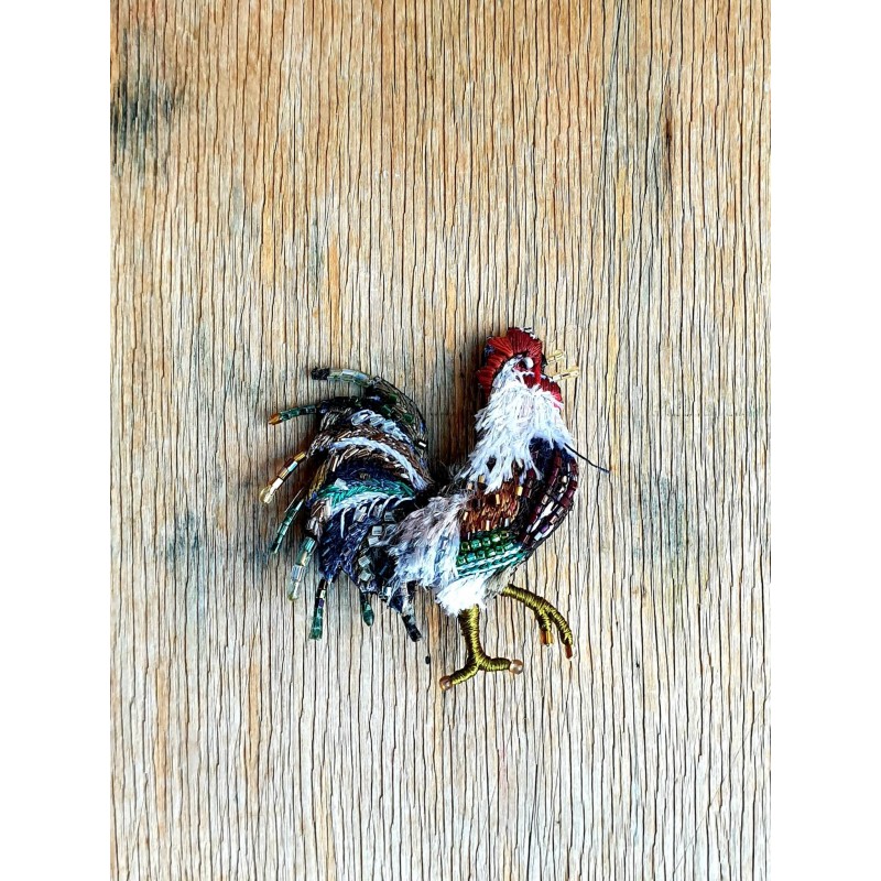 Trovelore sagė gaidys Rankų darbo siūlais ir karoliukais siuvinėta sagė. Medžiaga: medvilnė, veltinis, metalas, blizgučiai ir karoliukai; Siuvinėta rankomis Riboto tiražo Dydis: 5cm x 5cm Pagaminta Indijoje