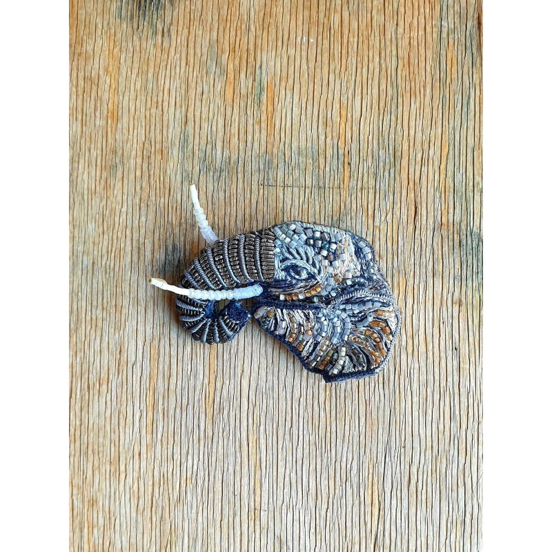 Rankų darbo siūlais ir karoliukais siuvinėta sagė.