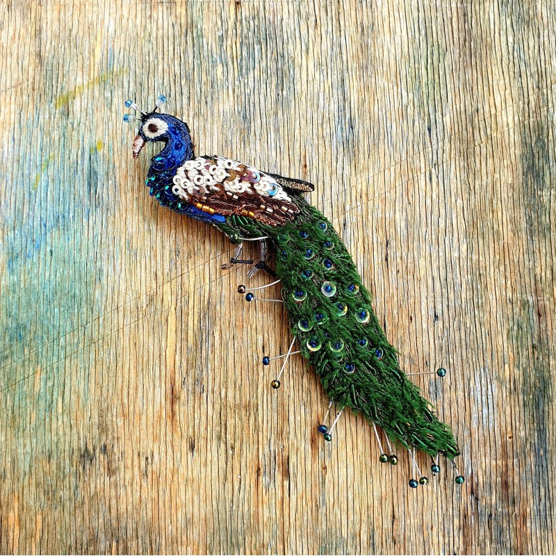 Rankų darbo siūlais ir karoliukais siuvinėta segė.