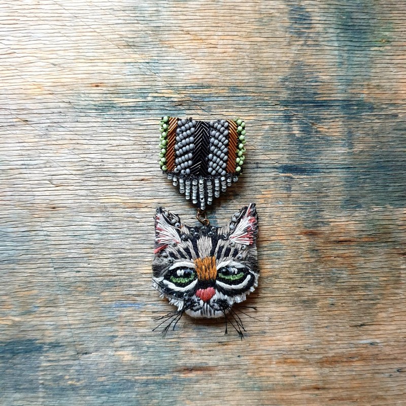 Rankų darbo siūlais ir karoliukais siuvinėta sagė.
