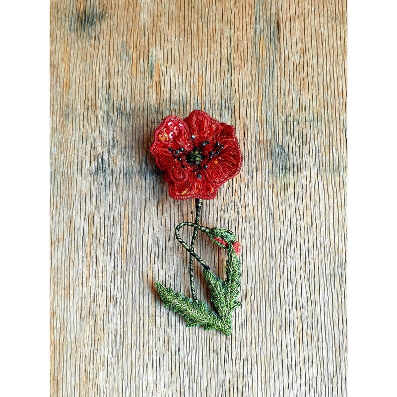 Rankų darbo siūlais ir karoliukais siuvinėta sagė.