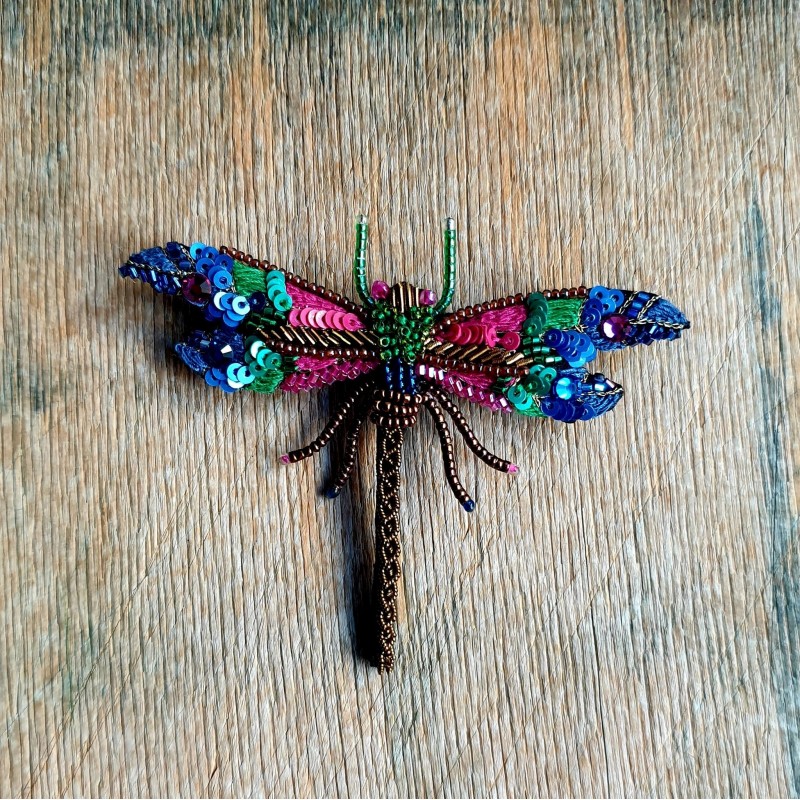 Rankų darbo siūlais ir karoliukais siuvinėta sagė.