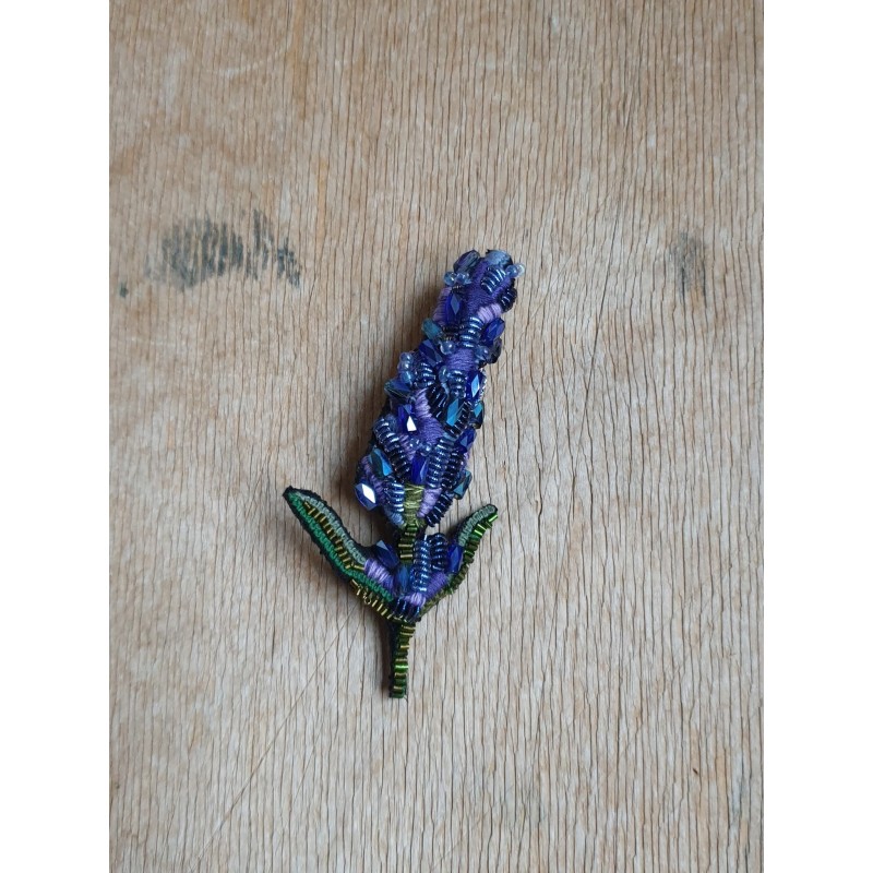 Rankų darbo siūlais ir karoliukais siuvinėta sagė.