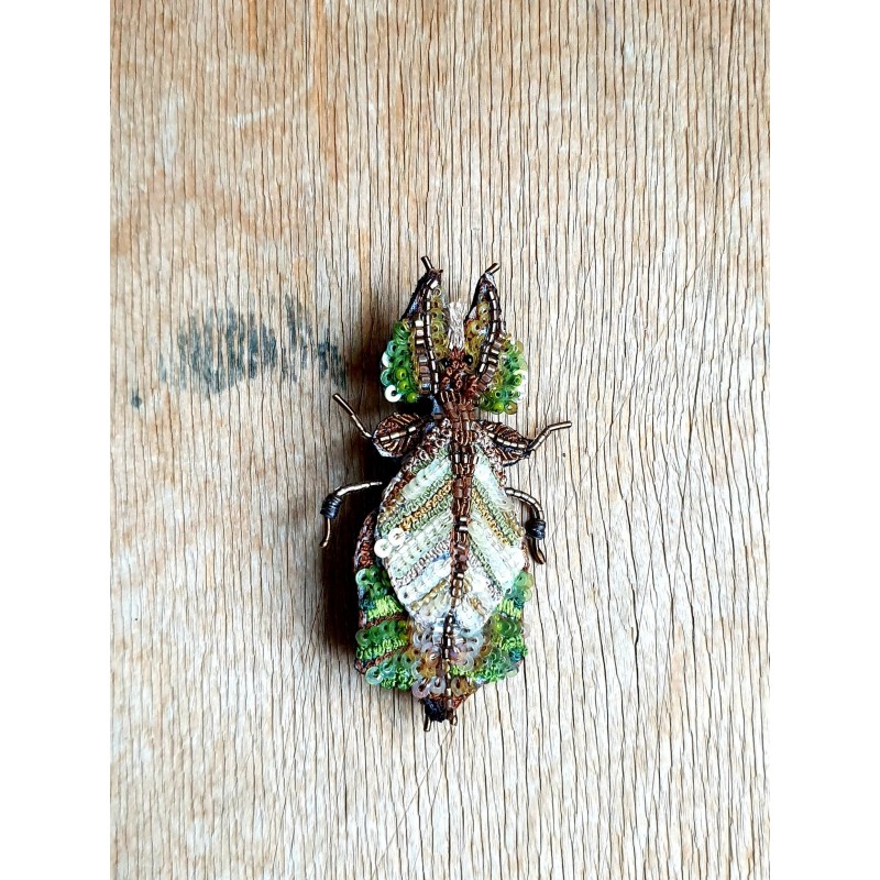 Rankų darbo siūlais ir karoliukais siuvinėta sagė.