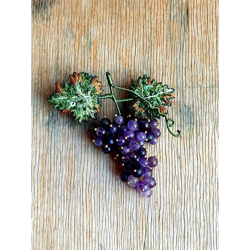 Rankų darbo siūlais ir karoliukais siuvinėta sagė.