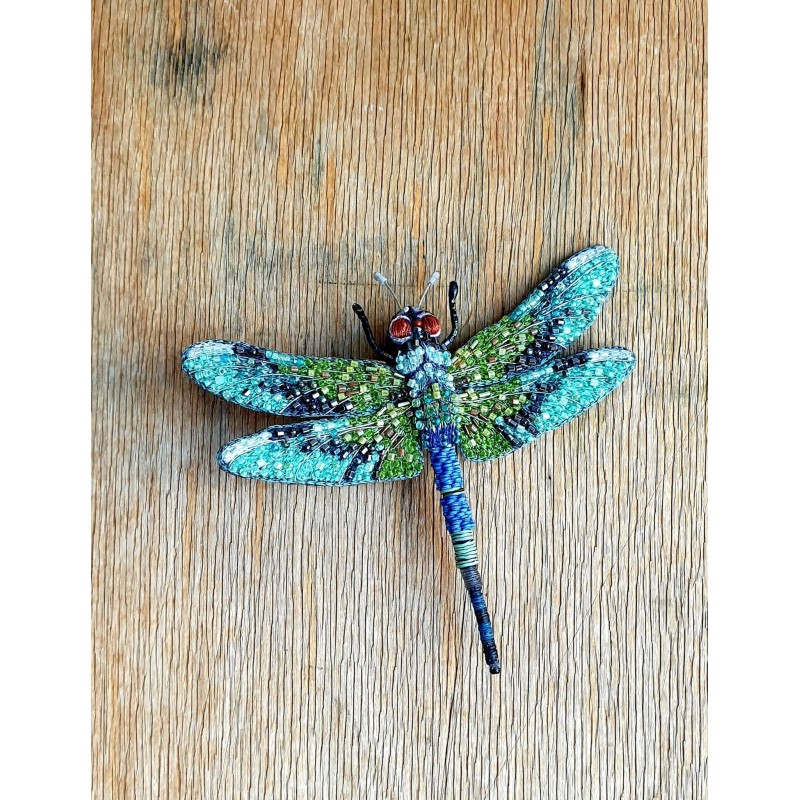 Rankų darbo siūlais ir karoliukais siuvinėta sagė.