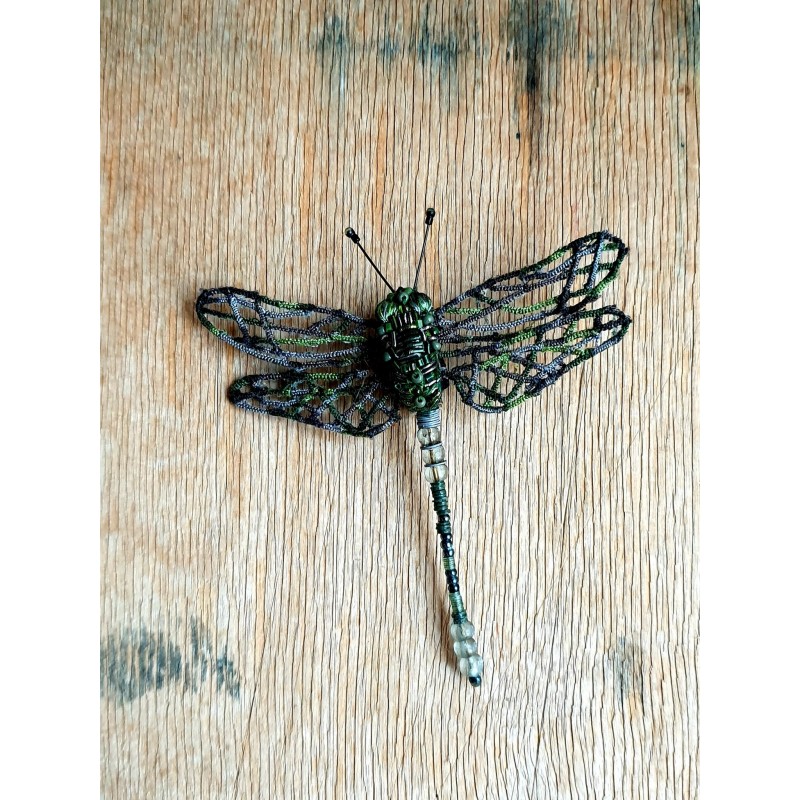 Rankų darbo siūlais ir karoliukais siuvinėta sagė.