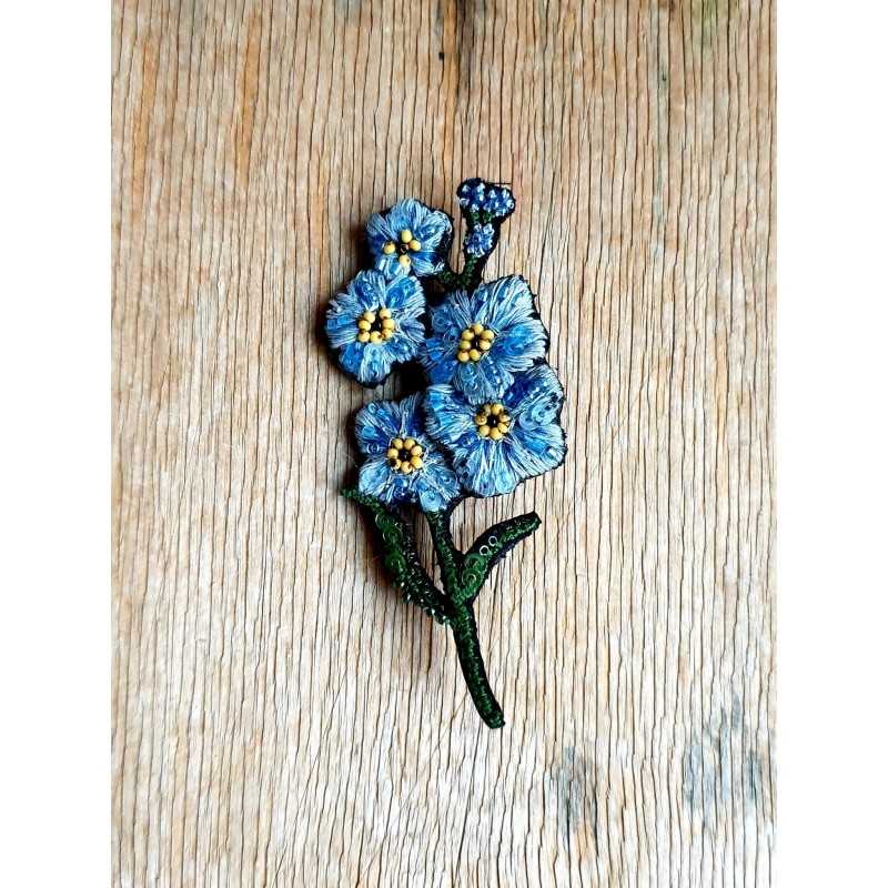 Rankų darbo siūlais ir karoliukais siuvinėta sagė.