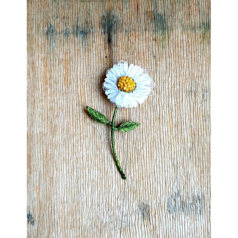 Rankų darbo siūlais ir karoliukais siuvinėta sagė.