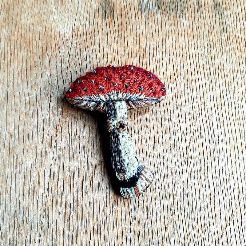 Rankų darbo siūlais ir karoliukais siuvinėta sagė.