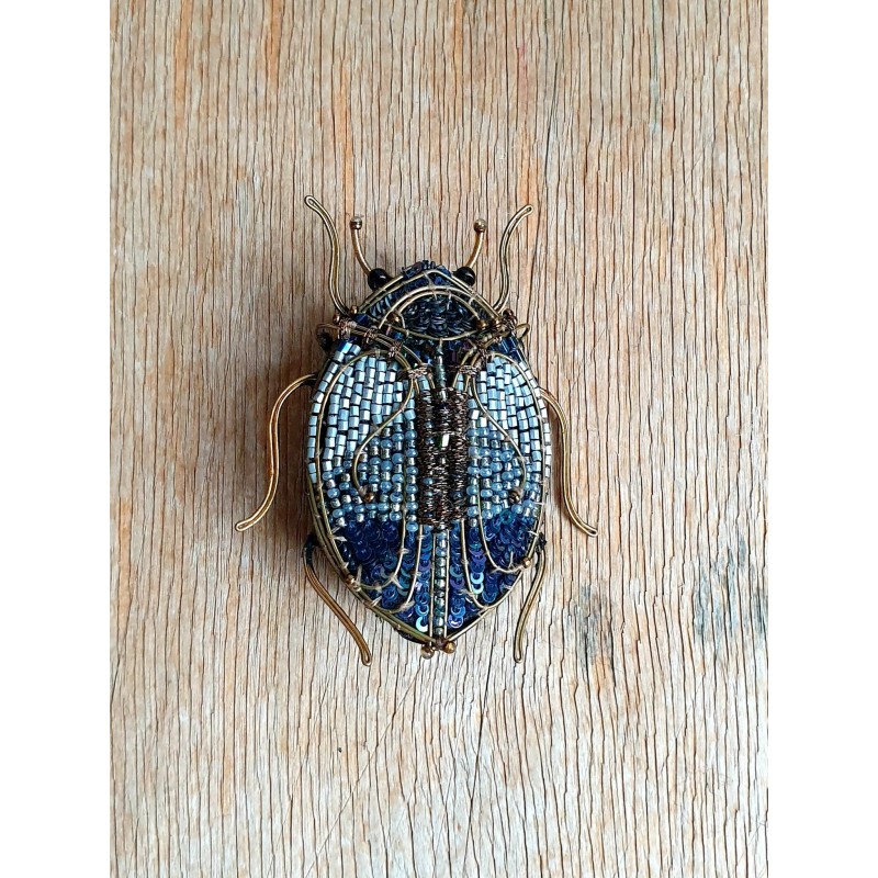 Rankų darbo siūlais ir karoliukais siuvinėta sagė.