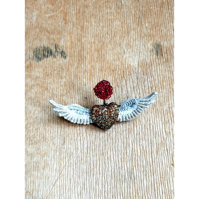 Rankų darbo siūlais ir karoliukais siuvinėta sagė.