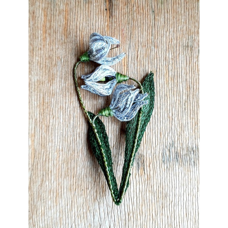 Rankų darbo siūlais ir karoliukais siuvinėta sagė.
