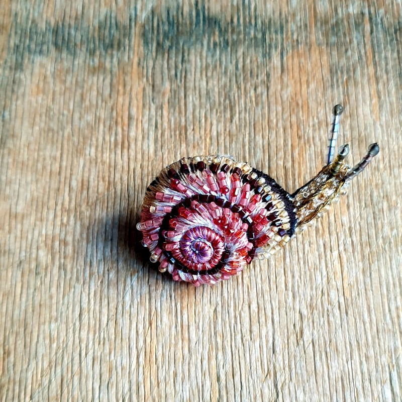 Rankų darbo siūlais ir karoliukais siuvinėta sagė.