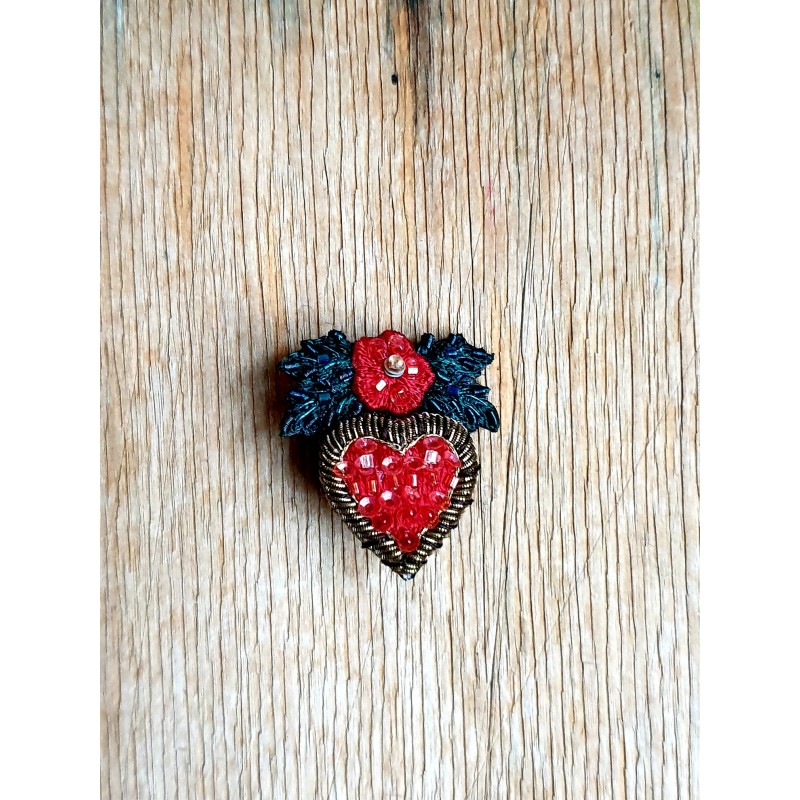 Rankų darbo siūlais ir karoliukais siuvinėta sagė.