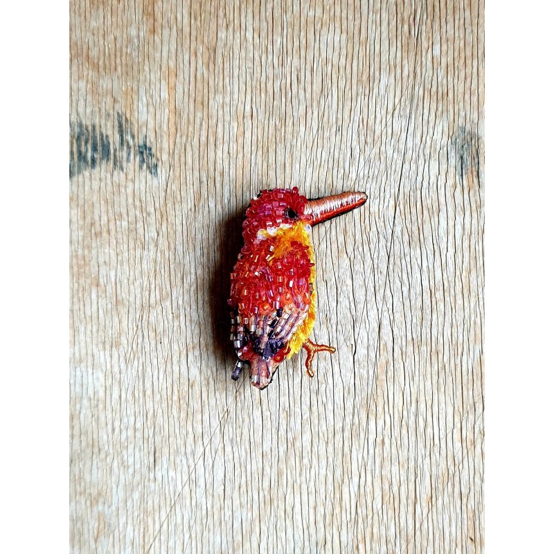 Rankų darbo siūlais ir karoliukais siuvinėta sagė.