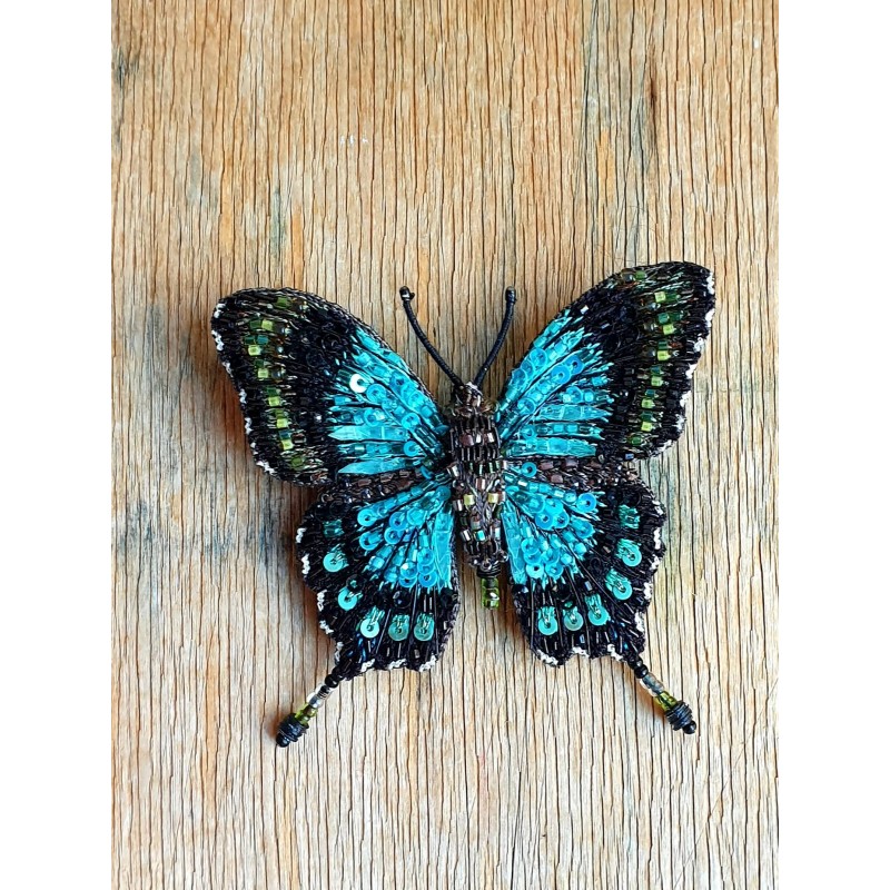 Rankų darbo siūlais ir karoliukais siuvinėta sagė.