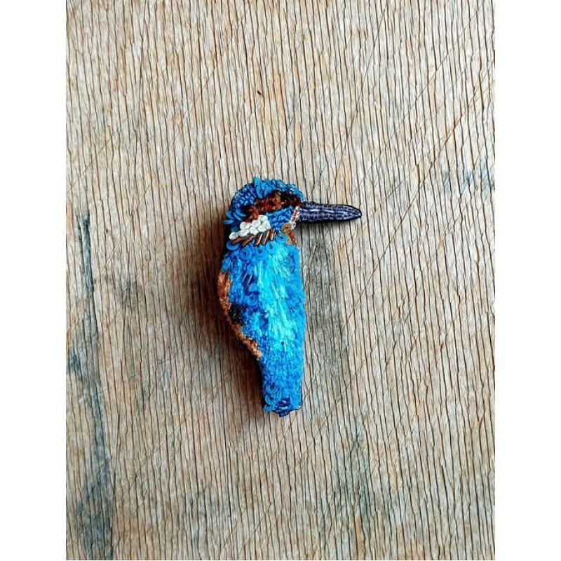 Rankų darbo siūlais ir karoliukais siuvinėta sagė.