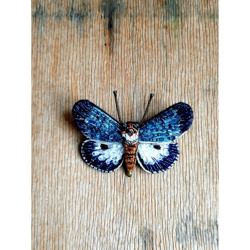 Rankų darbo siūlais ir karoliukais siuvinėta sagė.