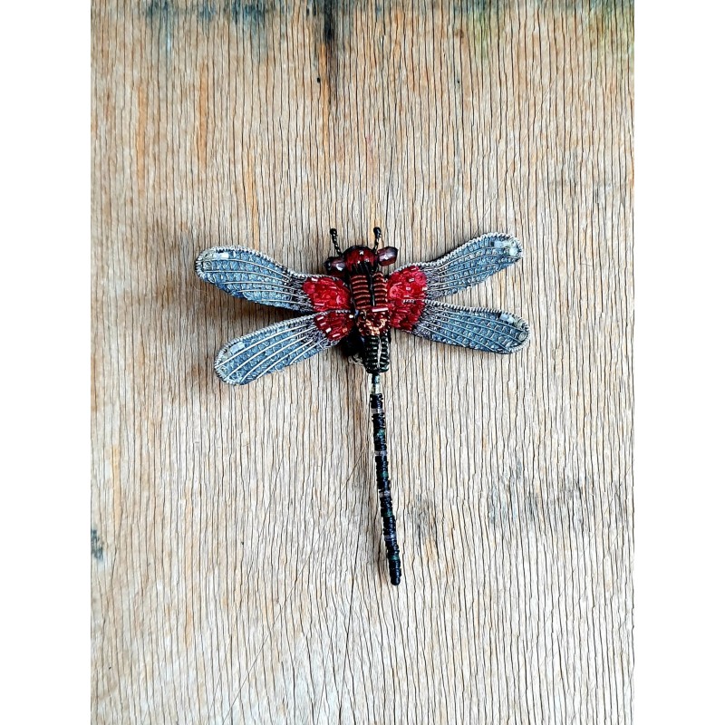 Rankų darbo siūlais ir karoliukais siuvinėta sagė.