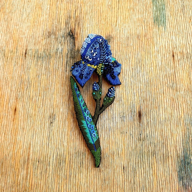 Rankų darbo siūlais ir karoliukais siuvinėta sagė.