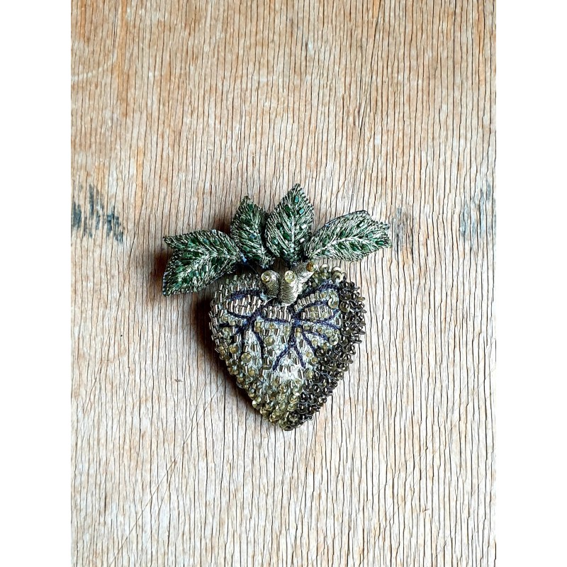 Rankų darbo siūlais ir karoliukais siuvinėta sagė.