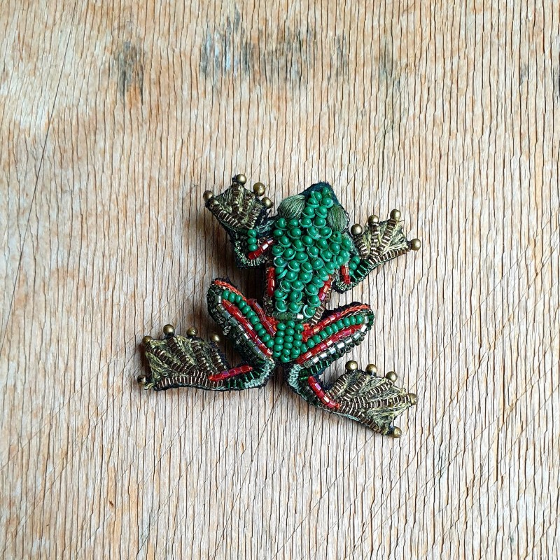 Rankų darbo siūlais ir karoliukais siuvinėta sagė.