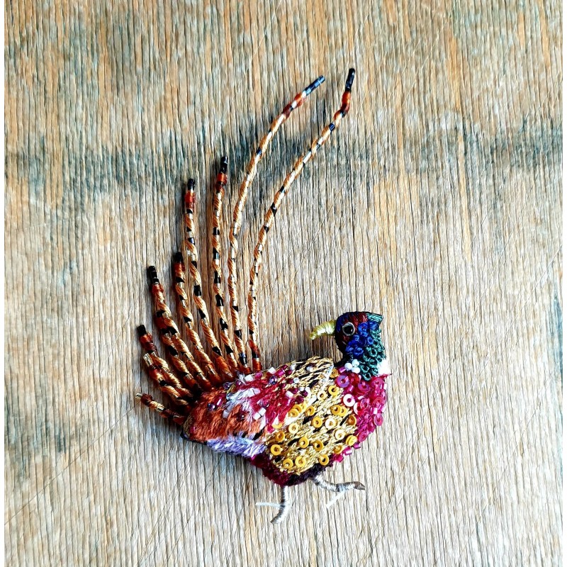 Rankų darbo siūlais ir karoliukais siuvinėta sagė.